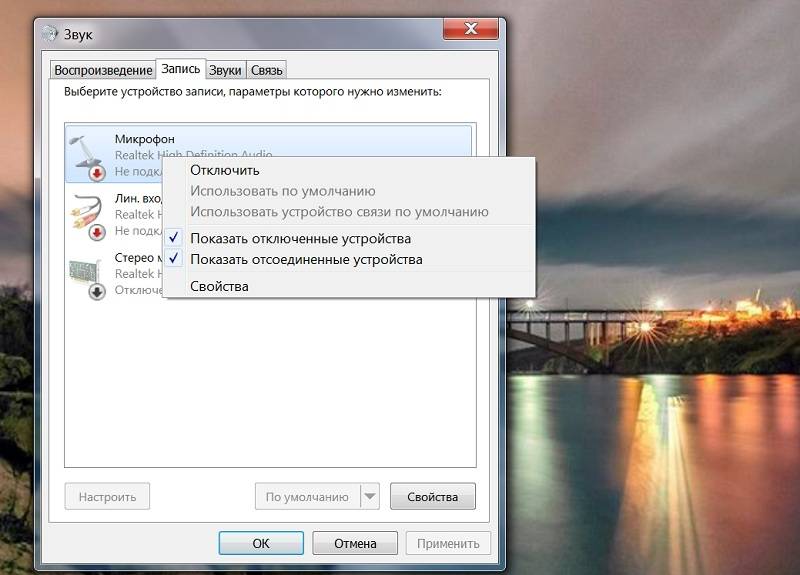 Чтобы задействовать в работе отключенный микрофон, щелкните по нему правой кнопкой мыши и выберите «Включить». Для назначения его основным устройством ввода кликните кнопку «По умолчанию». За этой кнопкой скрываются две дополнительных настройки – «Устройство по умолчанию» и «Устройство связи по умолчанию». При выборе второго варианта этот микрофон будет использоваться только для голосового общения по интернет-телефону, а девайсом по умолчанию для звукозаписи и прочего будет назначено что-то другое.