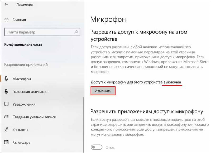 Информация, включен или выключен доступ к микрофону на этом устройстве, отображается в верхней части окна управления конфиденциальностью. Если он выключен, нажмите показанную на скриншоте кнопку «Изменить» и сдвиньте переключатель в противоположное положение.