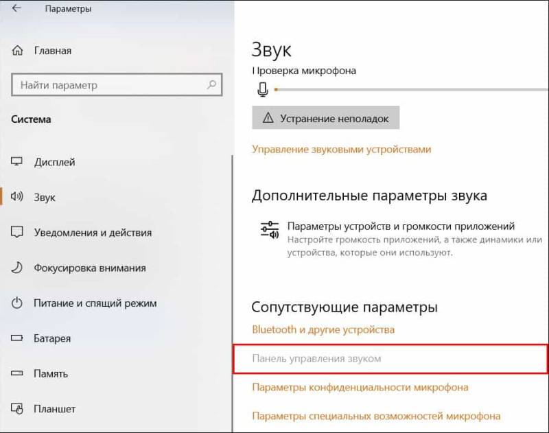 Точно такой же инструмент есть в Windows 10. Это «Панель управления звуком», она открывается из раздела «Сопутствующие параметры» того же окна, где находятся основные настройки микрофона.