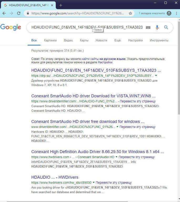 - После этого скопируйте это значение и как есть вставьте в окно поисковика. По данному «ИД» поисковая система обычно в первой же строке находит драйвер устройства, который нужно скачать. Перед скачиванием обязательно правильно выбрать версию драйвера, соответствующую разрядности вашей операционной системы.