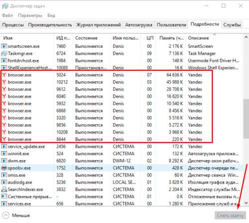 На операционных системах, вышедших после Windows 7, диспетчер задач несколько иной и там еще есть вкладка «Подробности», в которой тоже нужно закрыть все задачи связанные с вашим браузером.