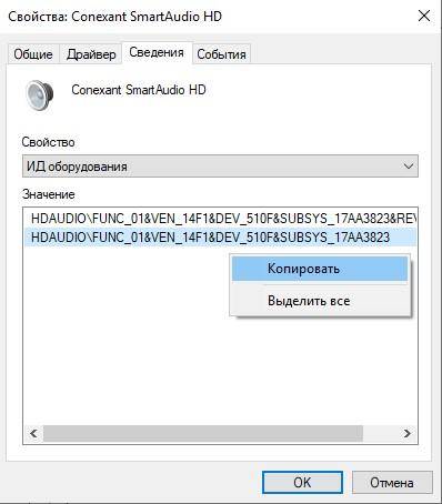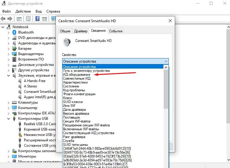 Если же компьютер не брендовый и был собран самостоятельно, тогда искать придется на сайте производителя материнской или звуковой платы. Поиск будет проводиться только по точному уникальному идентификатору. Чтобы узнать его, в том же окне диспетчера устройств (введем название утилиты в панель поиска и нажмем на первый результат) «Сведения». В списке свойств выбирается «ИД оборудования» – значение копируется и вставляется в поле поисковика.