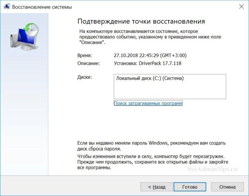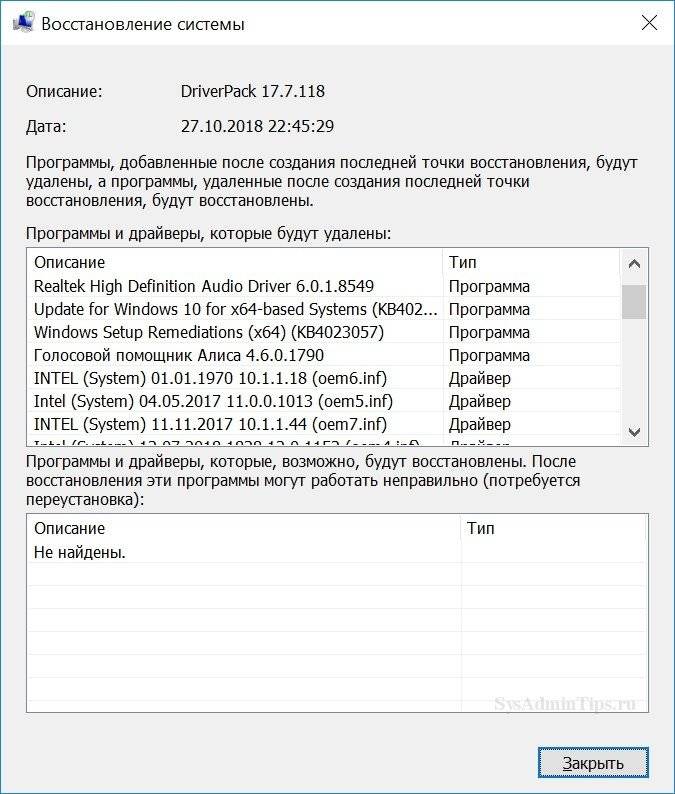 Система покажет, какие приложения и драйвера будут затронуты в ходе восстановления