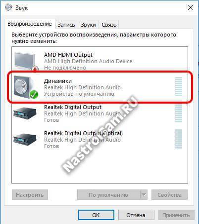 На вкладке  «Воспроизведение» обратите внимание, чтобы в списке была строчка «Динамики» и стояла галочка «Устройство по умолчанию».