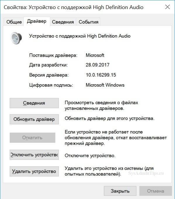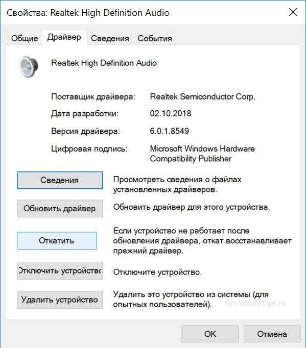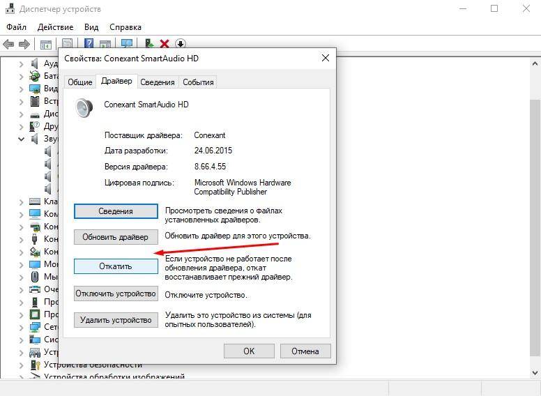 Ищу в списке устройство воспроизведения звука, захожу в свойства, перехожу во вкладку «Драйвер» и нажимаю на кнопку «Откатить».
