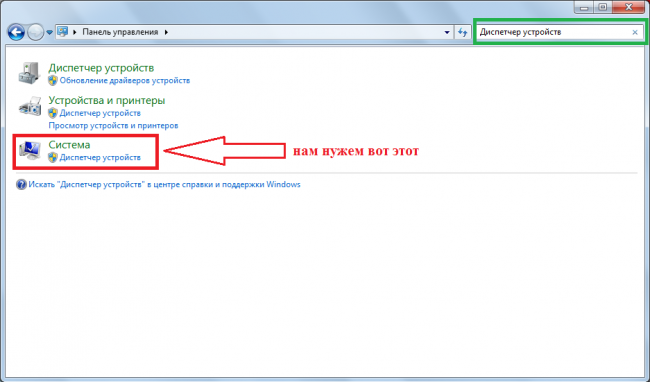 - В строке поиска (на рисунке №4 выделена зеленым цветом) следует написать «Диспетчер устройств». После этого нужно открыть тот диспетчер устройств, который находится в разделе «Система».
