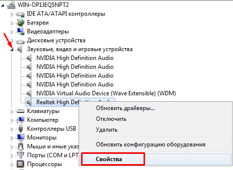 - В «Диспетчере устройств» выбрать свою звуковое устройство, нажать на него правой кнопкой мыши и перейти в свойства;