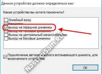 В ней смотрим какая выбрана конфигурация динамиков и в какой из разъёмов подключены динамики и соответствует ли одно — другому. Для чистоты эксперимента можно отключить коннектор от платы и подключить заново. Разъём должен автоматически определиться и спросить для чего он будет использоваться: