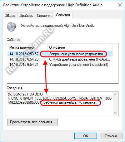 Кликаем на нём дважды и открываем свойства. На вкладке «Общие» сказано, что устройство работает нормально, а вот на вкладке «События» видим вот такую картину: