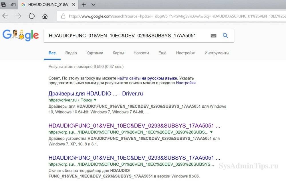 - После этого скопируйте это значение и как есть вставьте в окно поисковика. По данному «ИД» поисковая система обычно в первой же строке находит драйвер устройства, который нужно скачать. Перед скачиванием обязательно правильно выбрать версию драйвера, соответствующую разрядности вашей операционной системы.