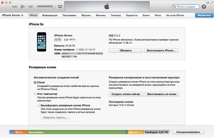 Откройте Айтюнс и синхронизируйте смартфон с программой. Далее убедитесь в том, что на ПК хранится копия файлов и установленных программ – бэкап. Если такой копии нет, создайте её.