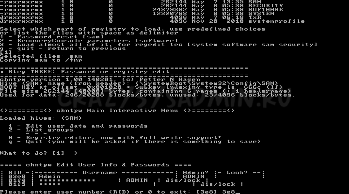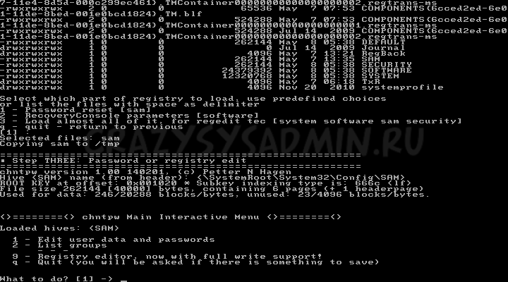 В следующем меню нам будет предложено провести различные манипуляции с пользователем, но нас интересует только пункт 1 – удаление пароля пользователя. Нажимаем 1, затем Enter.