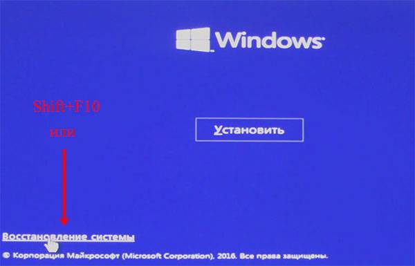 - После загрузки с флешки появится окно установки Windows. Нажмите «Shift+F10» или «Shift+Fn+F10», чтобы запустить командную строку. Если не получается, жмите «Восстановление системы».