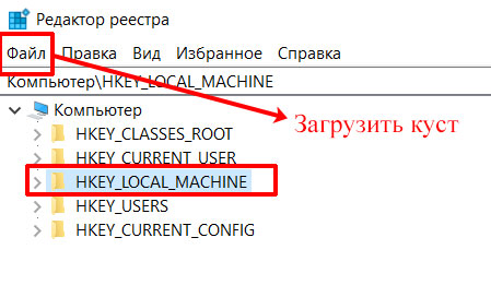 - Дальше выделите раздел «HKEY_LOCAL_MACHINE» и нажмите «Файл» – «Загрузить куст».