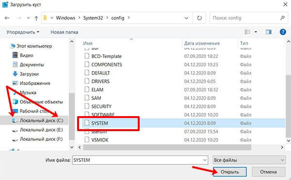 - Дальше нужно выделить файл «SYSTEM», он находится по пути: C:\Windows\System32\config. Жмите «Открыть». Первая «С» соответствует букве системного диска. Она может отличаться. Поэтому слева посмотрите, напротив какого локального диска есть значок Windows – это и будет нужная буква.