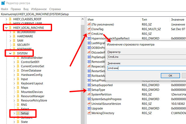 - Дальше прописывайте команду regedit, чтобы открыть реестр. В нем открывайте ветку: «HKEY_LOCAL_MACHINE» – «System» – «Setup». Для параметра «CmdLine» удалите значение «cmd.exe», а в «SetupType» снова установите «0».