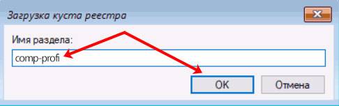 - В окне «Загрузка куста реестра» в поле «Имя раздела:» введите любое название, которое нужно запомнить. Я указал адрес сайта «vellisa.ru».