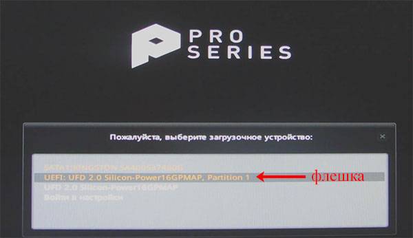 Вам нужно загрузиться не с жесткого диска, как это происходит обычно, а с подключенной флешки. Для этого можно нажать кнопку F11 до полного включения ПК, чтобы появилось окно выбора устройства загрузки, как показано ниже. Как войти в меню загрузки я подробно описала в отдельной статье. Или изменить приоритетность загрузки можно прямо в БИОС.