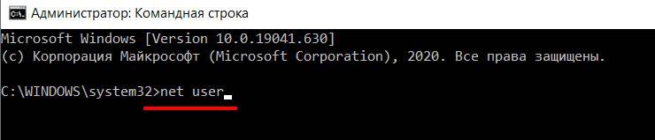 - В окне интерпретатора командной строки выполните команду «net user», которая отображает всех пользователей компьютера.