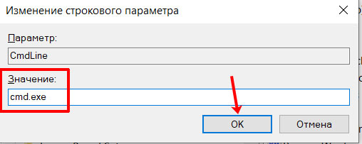 - Откроется окно для изменения выбранного параметра. В поле «Значение» укажите «cmd.exe» и нажмите «ОК».