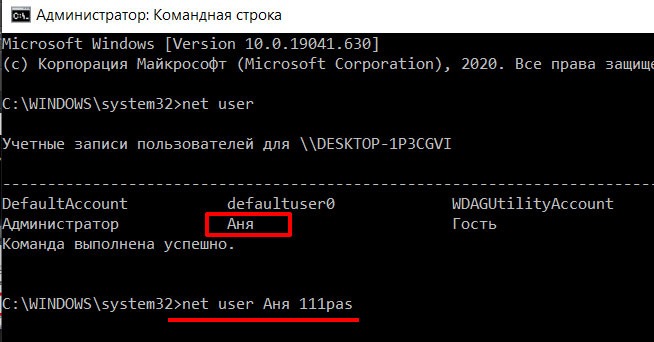 - Находите в списке имя учетной записи, для которой не можете вспомнить пароль. С помощью следующей команды можно его изменить: net user ИмяУчетки Пароль. Например, net user Аня 111pass.