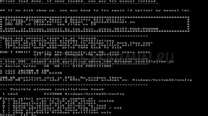 Выбираем цифрой нужный раздел, и нажимаем Enter.
