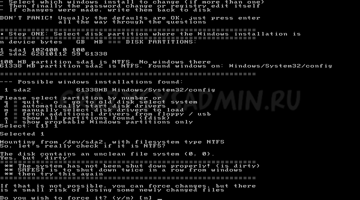 В нем говорится, что компьютер был выключен некорректно, и возможно при продолжении, некоторые последние изменения в системе будут потеряны, и крайне рекомендуется перезагрузить компьютер, подождать пока Windows сделает проверку диска, после чего перезагрузиться опять в Offline NT Password and Registry. Если вы ыне хотите рисковать, нажмите n и Enter. После этого программа сообщит вам, что можно повторить все по новой, но так как нам нужно перезагрузить компьютер, то просто жмем опять n, и потом Enter. Теперь перезагружаем свой компьютер, и выполняем проверку диска.