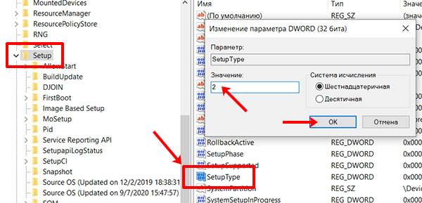 - Здесь же найдите параметр с названием «SetupType», кликните по нему и укажите для него значение «2».