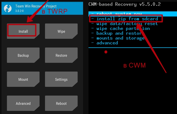 - при помощи команды «install zip from sdcard» в CWM-based.