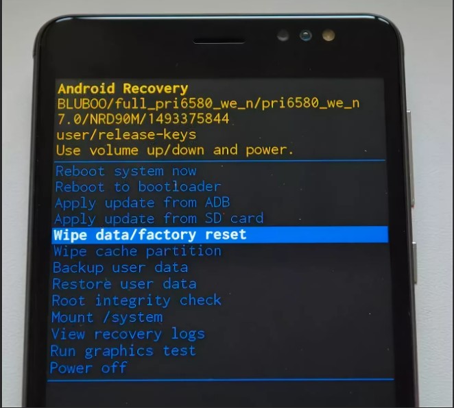 3. Перемещаясь по меню кнопками регулирования громкости, выбрать команду «Wipe data» / «Factory Reset» и подтвердить, нажав кнопку питания.