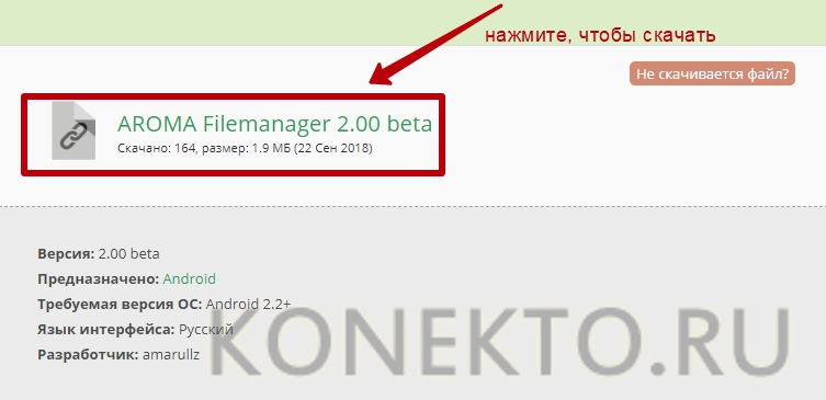 - Подсоедините телефон к ПК через кабель, скачайте файловый менеджер Aroma на компьютер и перенесите архив в папку “Download” на телефоне.