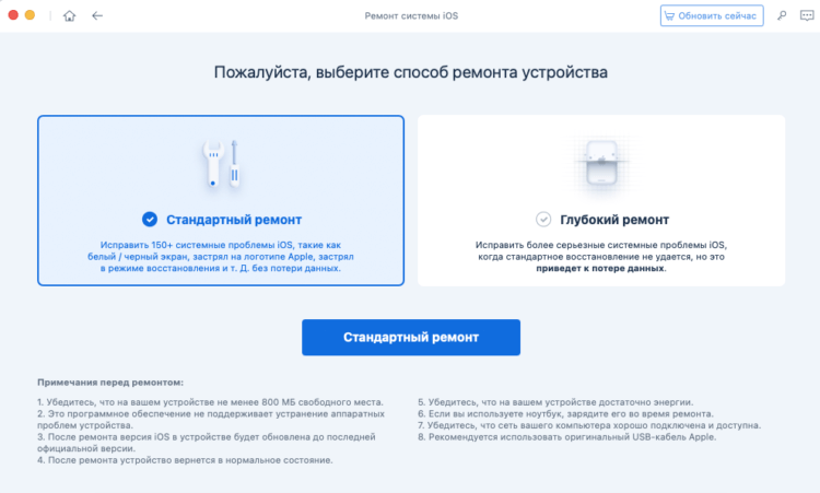 Наверное, вы заметили, что ReiBoot также предусматривает ещё и глубокий ремонт iPhone. Эта процедура отличается от стандартного ремонта тем, что проблемы исправляются на более глубоком уровне. В большинстве случаев настолько серьёзная отладка не требуется, поэтому прибегать к ней без крайней нужды всё-таки не рекомендуется. Она будет хороша в ситуациях, когда слетает прошивка устройства.