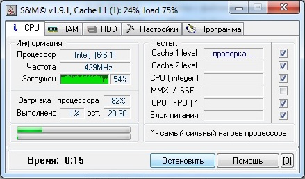 Это программа для тестирования температуры, стабильности работы и питания элементов процессора, оперативной памяти, материнской платы и жесткого диска. Утилита разработана Российскими программистами и позволяет пронаблюдать какие неполадки происходят в узлах ноутбука при нагрузке, можно настроить степень нагрузки на систему на 50, 75 или 100 процентов. Из этого теста можно узнать какие нагрузки может выдержать ваша система, какие температурные режима она выдерживает. Позволяет провести тест как отдельных элементов, так и всех сразу. Плюсом данной утилиты является то, что она не только находит наличие проблемы, но и определяет её источник.