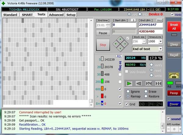 Основные возможности этой программы заключаются в проверке поверхности жесткого диска на наличие плохих секторов, проверка скорости записи/чтения жесткого диска. Можно определить правильно ли позиционирована головка диска. Позволяет установить или снять пароль на жестком диске. При обнаружение плохих секторов можно сделать ремап, это скрытие данных секторов, они переносятся в специально отведенную для этих целей область на жестком диске. Данная операция временная, позволяет вернуть работоспособность жесткого на неопределенный промежуток времени. Но в любом случае в скором времени жесткий диск потребует замены.