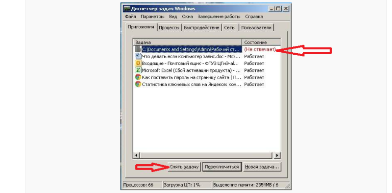 Выделите мышкой необходимую строку, задача которой не выполняется и кликните на «Снять задачу». Напротив задач, которые работают нормально, стоит слово «Выполняется». Задача, которая тормозит работу ПК будет указана в колонке «Состояние», как «Не отвечает».