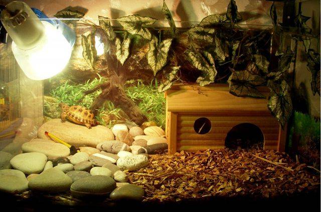 Над террариумом следует подвесить два светильника. Первый – с обычной лампой мощностью до 60 Вт, второй – с ультрафиолетовой. Ультрафиолетовая лампа должна время от времени (раз в год-полтора) заменяться на новую. Ультрафиолет жизненно необходим для черепахи: он способствует усвоению кальция, а значит, обеспечивает прочность внутреннего и внешнего скелета.