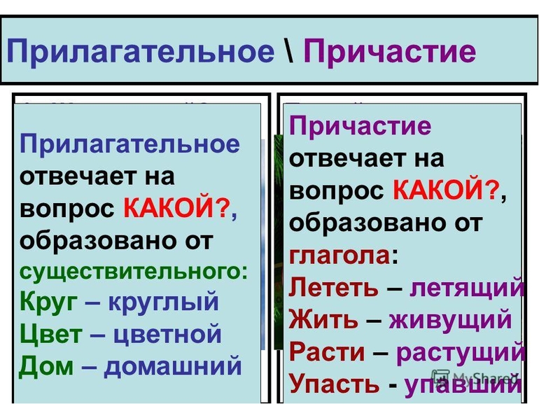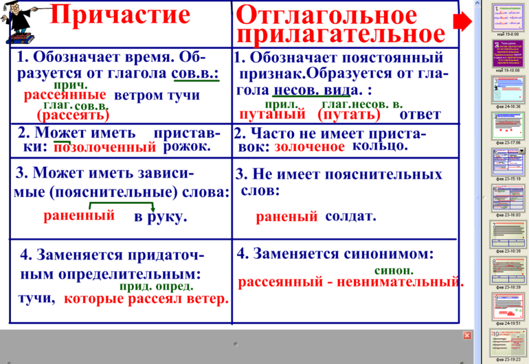 - Вид: совершенный и несовершенный (например: вечер (какой?) дремлющий (что делать? – дремать); кот спрыгнувший (что сделать? – спрыгнуть);