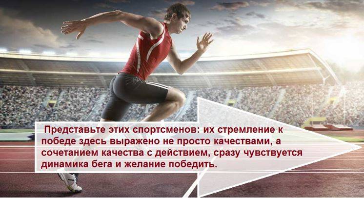 Например: Мы видим бегущих по дорожке спортсменов, старающихся прийти к финишу первыми, делающих последний решающий рывок к заветной ленте. Что вы увидели в своем воображении?