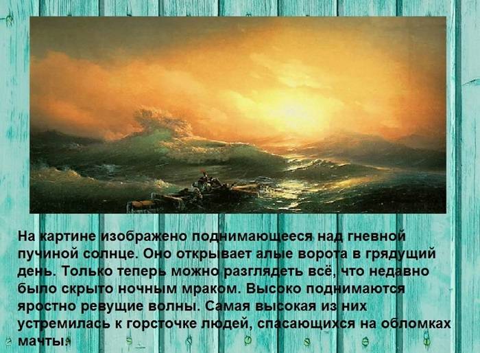 Рассмотри картину И.К. Айвазовского «Девятый вал» и прочитай ее описание. Найди в тексте описания все причастия.