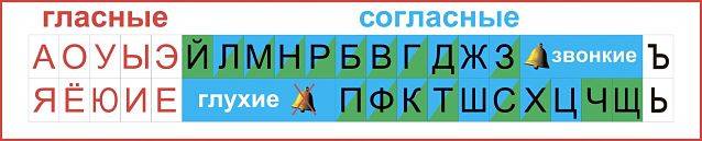 Полностью рассмотреть глухие и звонкие, твердые и мягкие согласные, а также ударные и безударные гласные поможет таблица, представленная на нашем сайте. Ее можно повесить в классе, где дети приступили к более подробному изучению русского алфавита. Также вполне резонно будет повесить таблицу на видном месте дома, если малыш начинает изучать буквы.