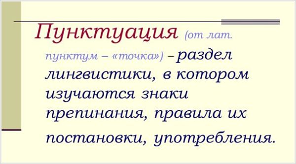 Пунктуация ( от лат. punctum – точка) – это раздел русского языка, который изучает расстановку знаков препинания, а также сама система знаков препинания. Пунктуация в русском языке служит для того, чтобы максимально точно передавать на письме то, что хотел выразить автор. Правила пунктуации созданы для того, чтобы регулировать интонационный строй речи, а также синтаксические и смысловые отношения в языке.