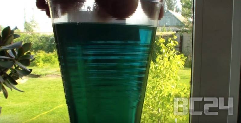 Далее смешаем все наши стаканчики в одну посудину. В результате получили абсолютно прозрачную жидкость сине-зеленого цвета без примесей и хлопьев.