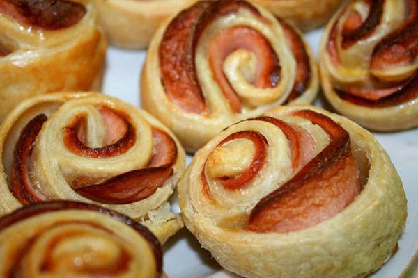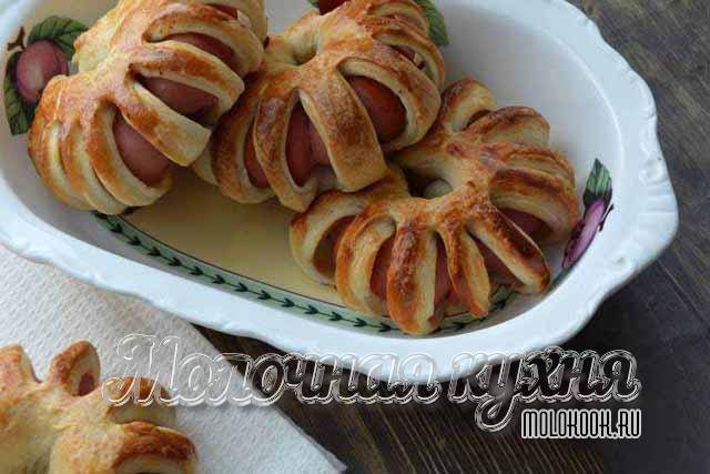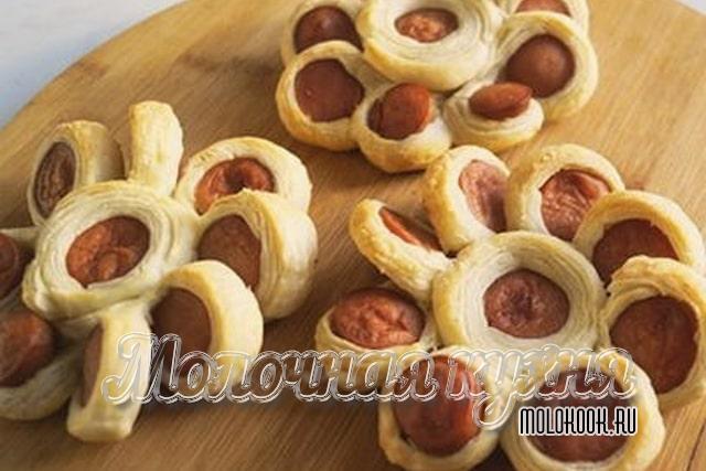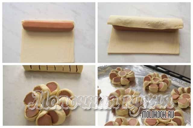 Булочки «Цветочки» из слоеного теста с сосисками в духовке