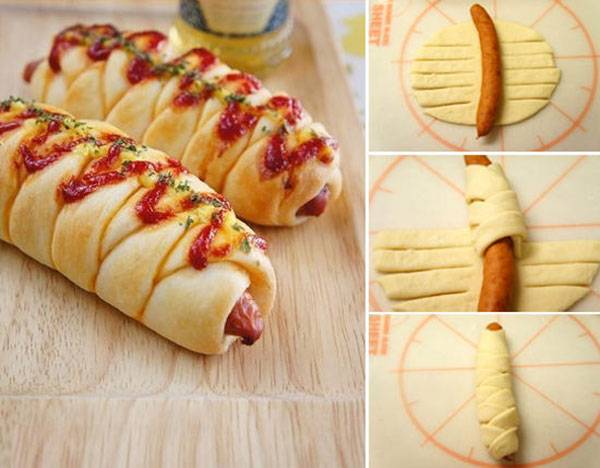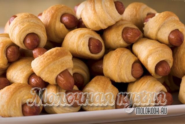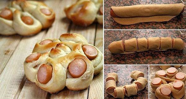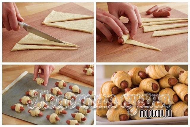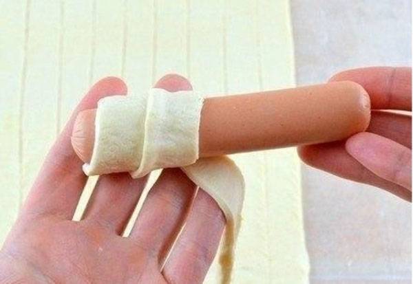 Завернуть в тесто сосиски. Если есть сыр, то можно сначала на пласт теста уложить сыр, а затем сосиску.