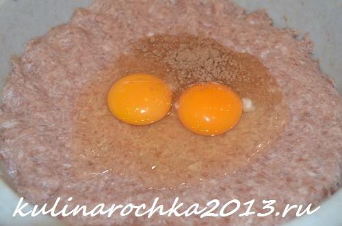 Через сутки добавляем к фаршу яйца, чеснок и мускатный орех. Вымешиваем до однородности.