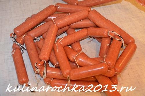 Набиваем оболочку, стараясь делать это как можно плотнее. Сразу можно перевязывать сосиски с помощью нити. Делайте их по 7-10 или 12-15 см. Это уже дело ваше. К сожалению, мы не на производстве, поэтому, просто перекручивать их не получается, оболочка тут же разматывается.
