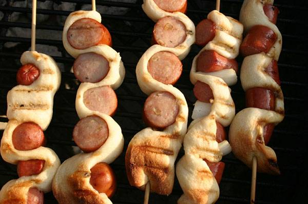 - Сосиски порезать кружочками, а тесто – квадратиками. Чередуя ингредиенты, наколоть их на зубочистку или тонкую деревянную палочку. Запечь в духовке до готовности. Подавать с соусом барбекю или кетчупом.