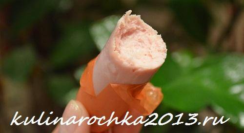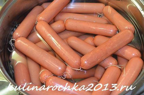 - Сосиски освободите от целлофана, опустите в кипяток, поварите 2 минуты, извлеките из воды, остудите и разрежьте пополам поперек.
