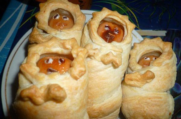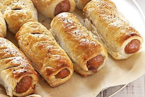 - Уложить сосиски на прямоугольники из слоеного теста, свернуть рулетами, хорошо обжать верх и низ. Переложить на пекарскую бумагу, порезать на кружочки. Смазать яйцом и присыпать кунжутным семенем. Запечь, нанизать на шпажки. Также такую закуску можно жарить на мангале или сковороде. Но не стоит забывать, что запеченная выпечка содержит меньше калорий, чем жареная.
