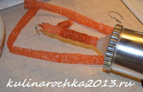 Тесто раскатать при помощи скалки и нарезать его на полоски.